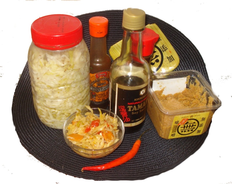 Sauerkraut, kimchi, yoghurt, amasi, kefir, cottage cheese, all popular cheeses, olives, pickles like gherkins, Tabasco sauce, soy sauce, Worcester sauce, tamari, natto, miso, sour bread, kombucha, beer, wine and pickled lemons. Learn how to make a few of them with my basic guidelines. Making your own kimchi is a good way to begin as it introduces lactic acid - a by-product of anaerobic fermentation, giving it a sour taste, without adding vinegar.